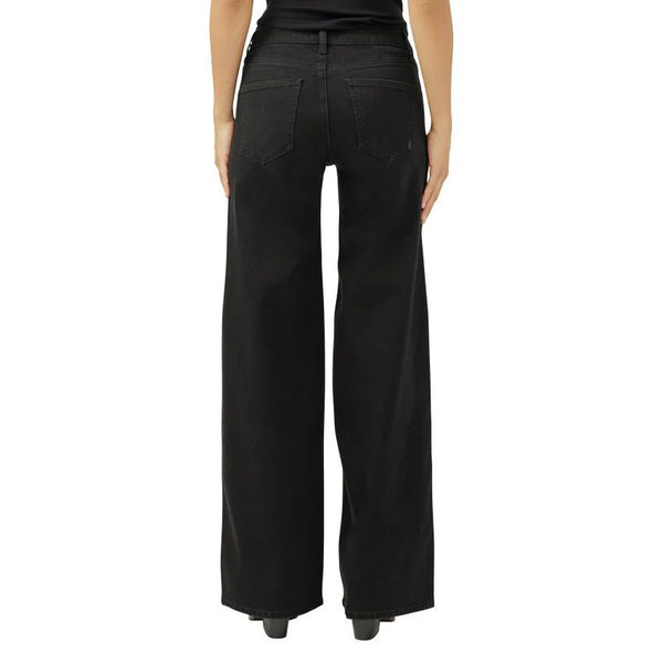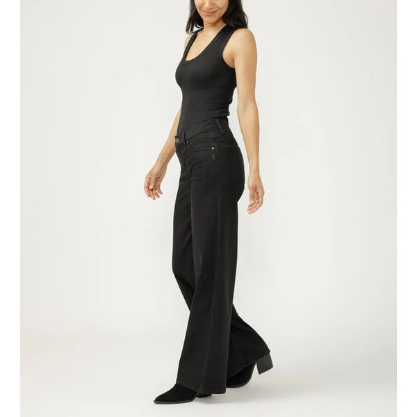 Curvy Friendly Style! Experience timeless elegance with the Silver Suki Wide Leg in black. Made from Luxe Stretch denim, these wide-leg jeans offer a comfortable yet figure-enhancing fit that retains its shape throughout the day. Featuring a mid-rise and contoured waistband, they provide a flawless, gap-free silhouette. Classic five-pocket details and a zip fly complete this refined design, making these jeans a sophisticated and reliable choice for any wardrobe.