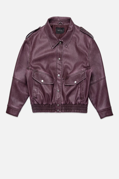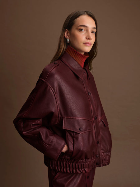 Vegan leather bomber jacket with point collar and long sleeves with buttoned cuffs. Elasticized waistband. Front pockets with flap. Epaulettes on shoulders. Front snap buttons closure. Lined garment. Distressed look. Pair it with the Thomas skirt