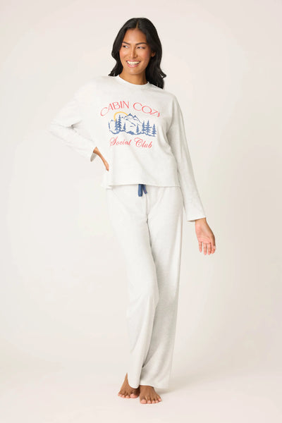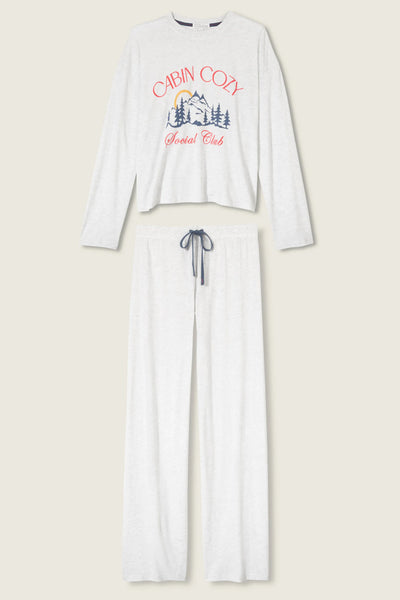 Celebrate cozy season in this cloud-white pajama set, made from soft jersey with a cropped long sleeve top and relaxed drawstring pants. The “Cabin Cozy Social Club” graphic channels mountain-lodge vibes—perfect for snowy mornings and winter nights in.