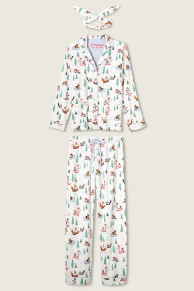 Paw-sitively cozy and snow much fun, this three-piece flannel set is made from soft cotton in a classic twill weave, complete with a button-front top, relaxed drawstring pants, and a matching headband. The winter-white backdrop is scattered with playful pups skiing, sledding, and tubing through the trees, finished with contrast piping and a cheeky cuff that reads “Sleigh All Day.” Perfect for snow days, couch days, and snoozing after all the fun.