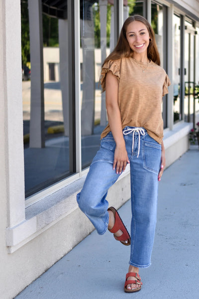 Made from comfort stretch denim, the Vervet Drawstring Barrel Jean features an elastic drawstring waist for a customizable, secure fit. Its wide, tapered leg and ankle length offer a relaxed yet polished look, providing both style and ease throughout your day. Perfect for those seeking denim that supports movement and comfort.